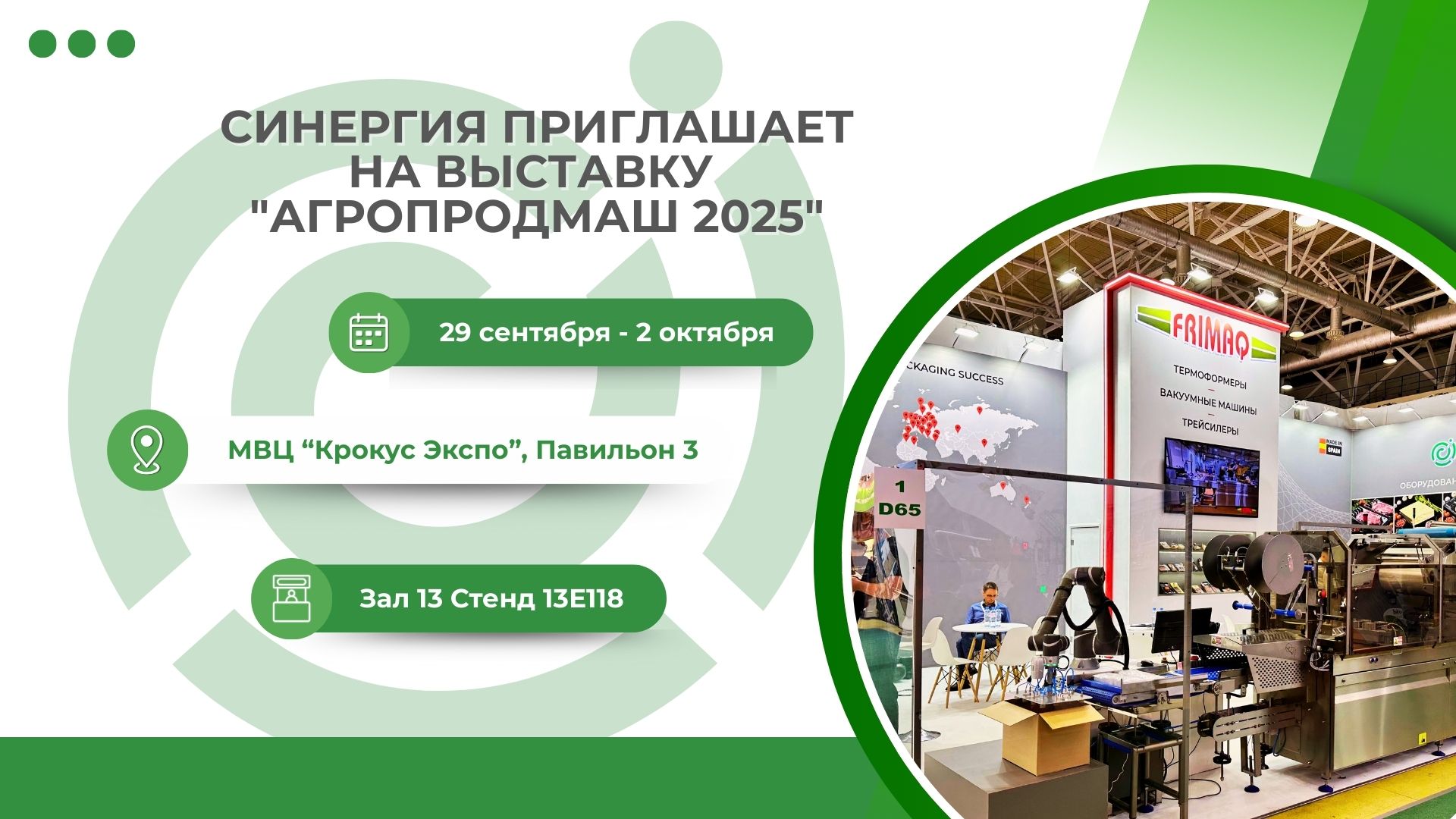 СИНЕРГИЯ приглашает посетить выставку АГРОПРОДМАШ 2025! С 29 сентября по 2 октября 2025 года в МВЦ «Крокус Экспо» (г. Красногорск, РФ) откроется 30-я Международная выставка «АГРОПРОДМАШ», где мы представим инновационные решения в сфере пищевой упаковки.