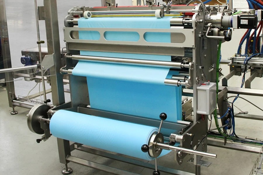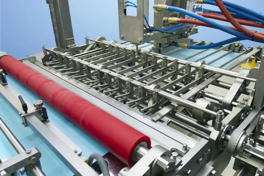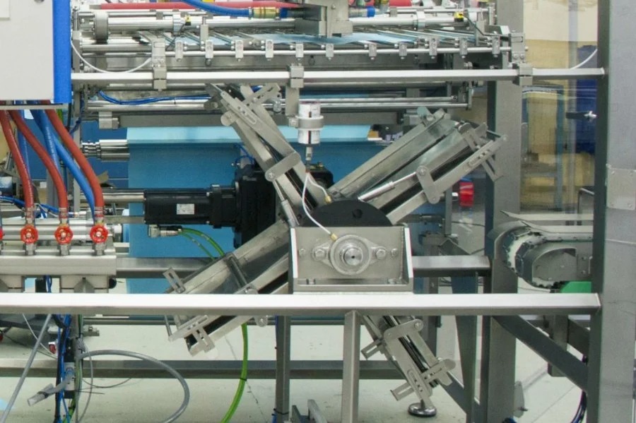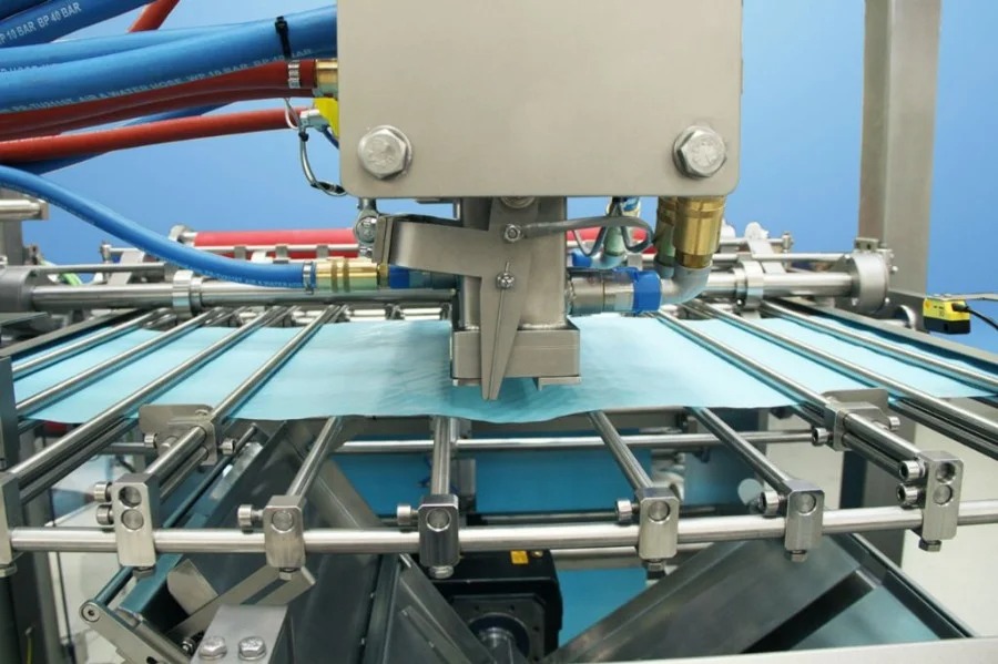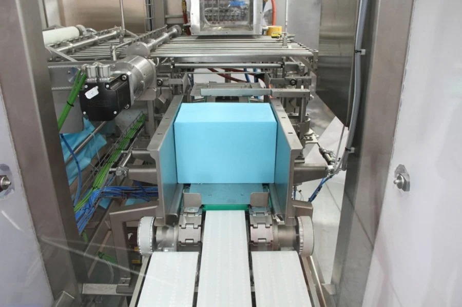 Упаковочный материал обрезается до требуемой длины и помещается под систему подачи продукта, которая настраивает конечные размеры блока. Сформированный блок продукта отрезается с помощью специальной струны и помещается на упаковочный материал. Это позволяет упаковывать большие объемы без затратного времени на процедуры. Последний этап упаковки включает оборачивание и закрытие блока.