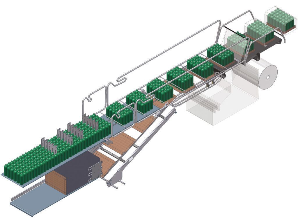 - Входной конвейер с цепями из термопластичного материала с низким коэффициентом трения и моторизованной системой направляющих качающихся каналов.