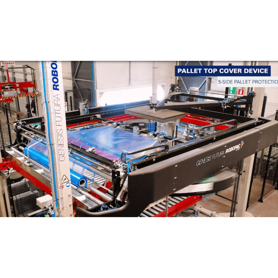 Robopac Genesis Futura — автоматический паллетообмотчик с вращающимся кольцом, предназначенный для упаковки до 90 паллет в час. Оборудование применяется для эффективной упаковки паллет на складах и в производственных зонах.