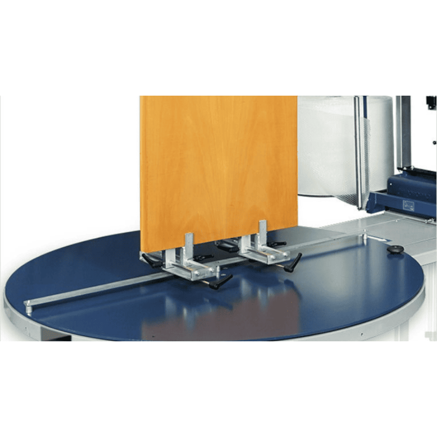 - Верхний механический держатель и крепления на вращающемся столе обеспечивают стабильность упаковки даже для тонких и нестандартных изделий.