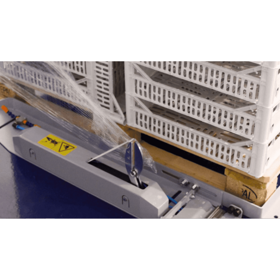 Паллетообмотчик оснащается двухмоторной или одномоторной кареткой в зависимости от конфигурации. Машина автоматически отрезает и припаивает конец плёнки, а клещевой захват фиксирует плёнку перед началом следующего цикла упаковки. Управление осуществляется через панель с сенсорным дисплеем.